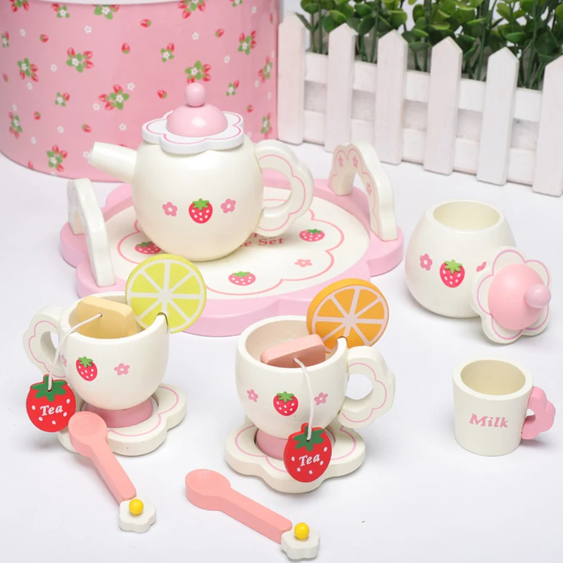 Wooden Mini Tea Set Toy Cup Teapots Tray for Children Kids Kitchen Role Playing Game QP2